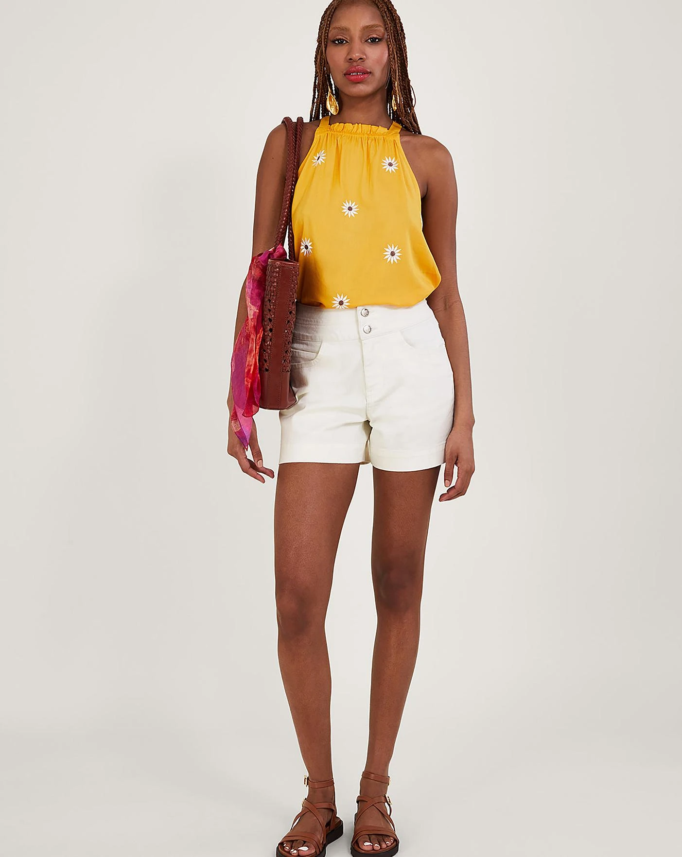 - Summer just isn’t the same without a pair of denim shorts on hand. This pair is designed with a high-waisted silhouette and a secure double-button fastening to finish. Style them with a simple cami, or opt for a more smart-cas’ look with a light and airy blouse. As part of the journey to make our clothes kinder to the world around us, this item was made using more sustainable raw materials, such as organic cotton, recycled polyester and viscose from responsibly grown forests.