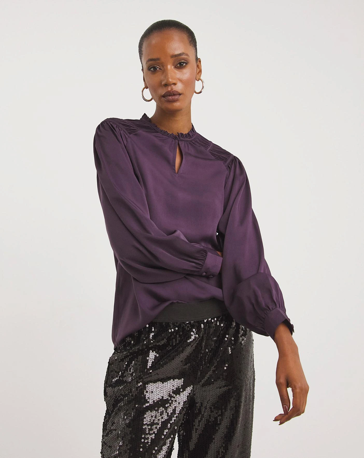 For a sophisticated look, choose our pleated shoulder matte satin top. With a key hole detail, pleated shoulder and long sleeves, this top can be worn tucked into leather trousers. Alternatively you can choose to pair with sequin trousers as shown in the photography. This top comes in a relaxed fit, so we would recommend sticking to your usual size.