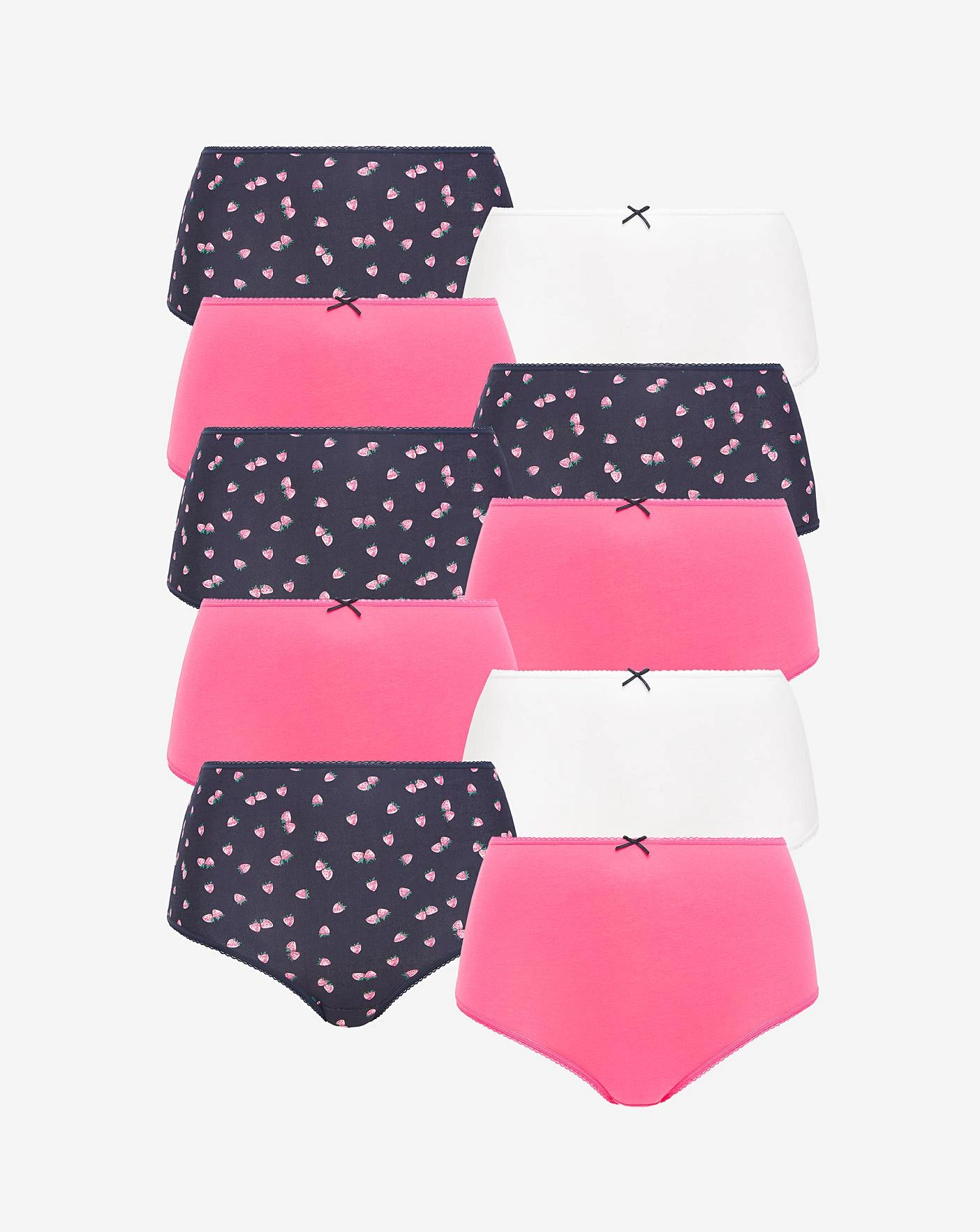 Presented in a high value pack of 10, these full-fit briefs are a must-have addition to your lingerie collection. Perfect for everyday wear, these briefs offer the most coverage, with a flattering high waist and full bottom to smooth over your derriere. Made from 100% cotton, these briefs are incredibly comfortable and feel so soft against the skin, and the pretty, picot edge adds a delicate finishing touch. By choosing our cotton products, you are supporting Pretty Secrets investment in Better Cottons mission. This product is sourced via a system of mass balance and therefore may not contain Better Cotton. bettercotton.org/learnmore