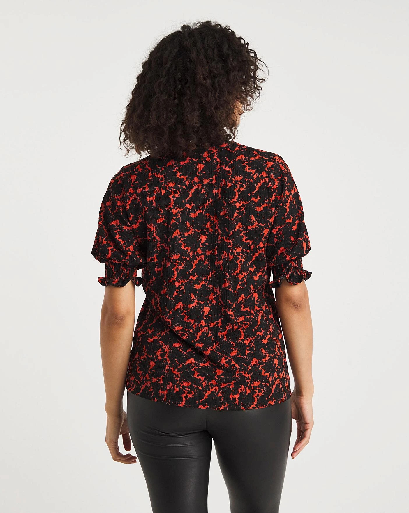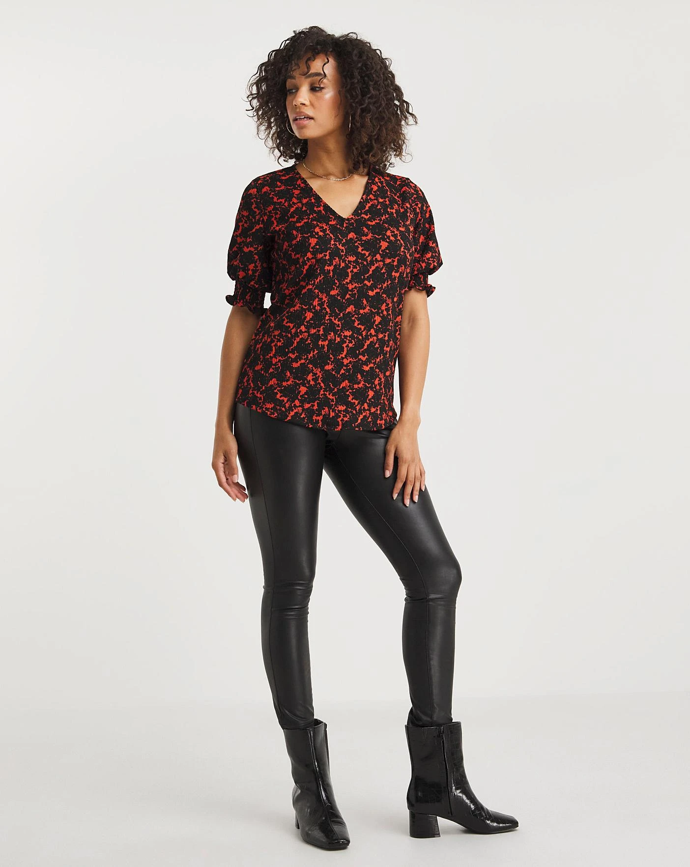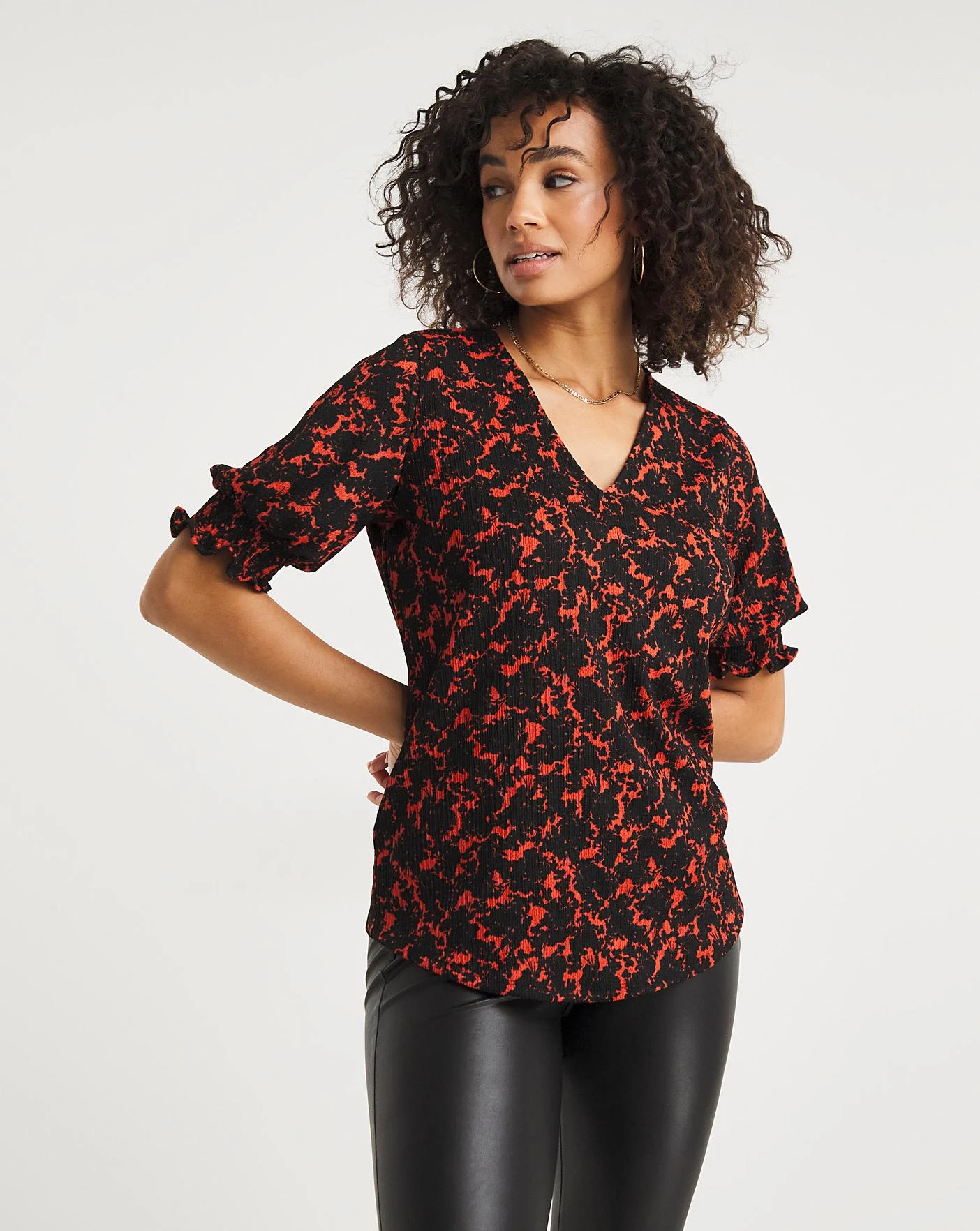 This crinkle jersey top features a beautiful all over print with a v neck and three quarter length sleeves. This top length is perfect to wear with jeans and due to the crinkle fabric no ironing is needed.