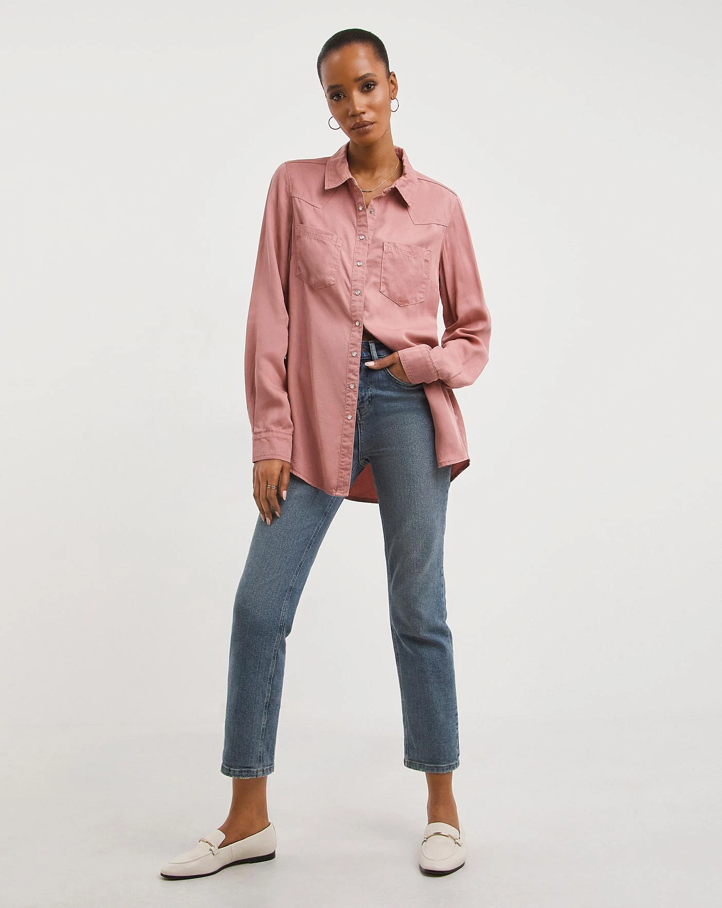 A must have staple in your wardrobe! Our western denim shirt has been updated for the season in a gorgeous rose wash. It features two front pockets, a button up front and made from a comfortable lyocell fabric. Dare to wear double denim with your favourite pair of black jeans or wear unbuttoned over a plain white tee for the perfect casual daytime look.