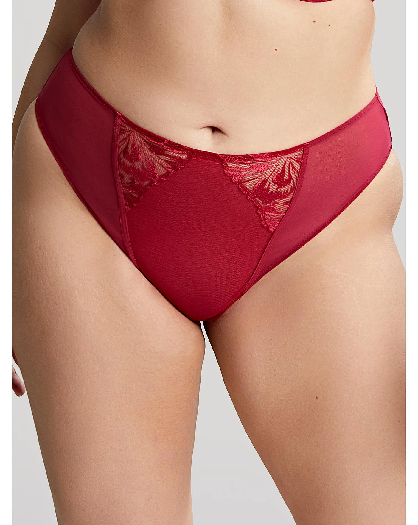 - High leg brief with embroidered inserts and twin needle back legs for no vpl – in Scarlet Red