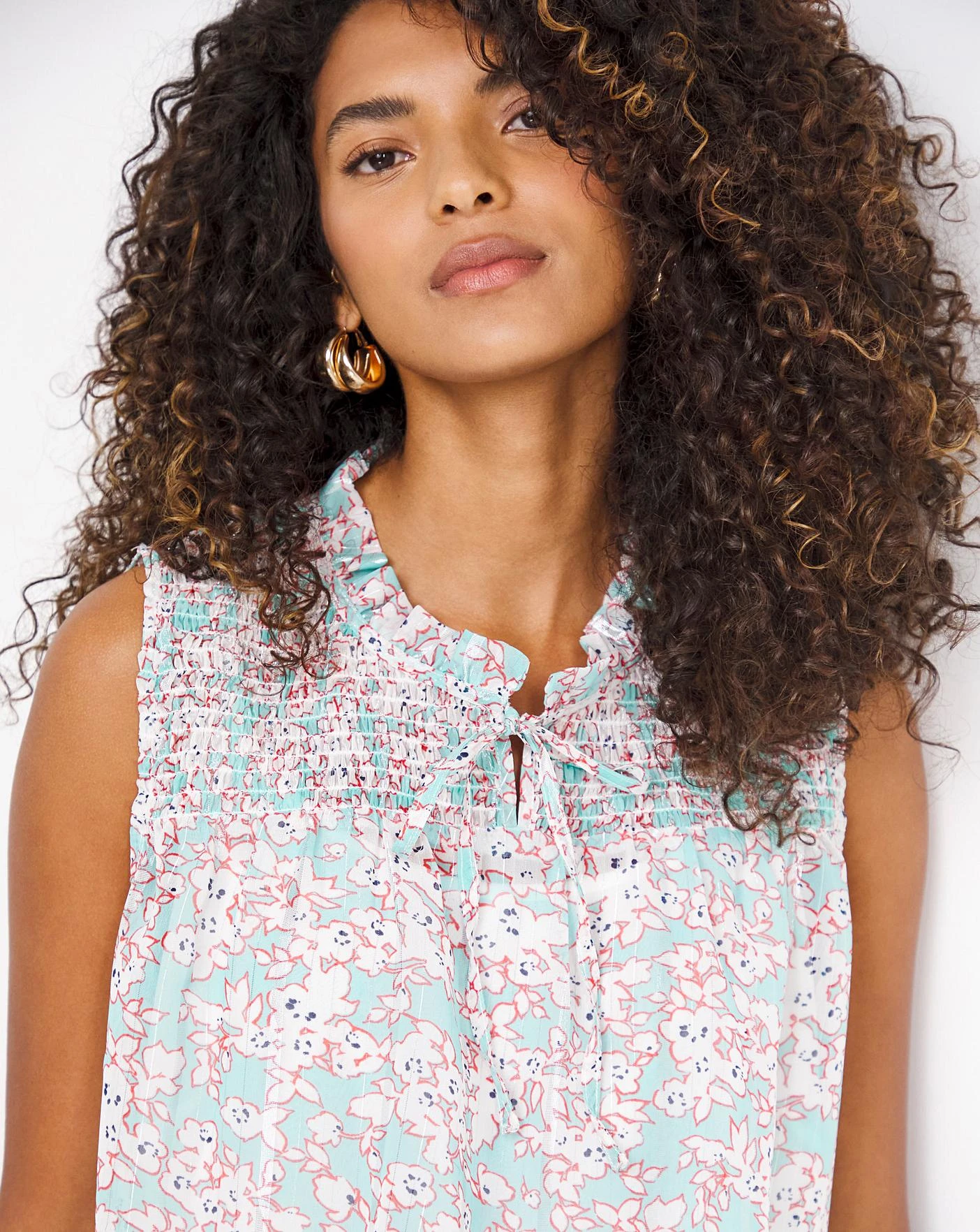 Embrace the new season with our sleeveless lurex shirred yoke top. In a stunning summer print, this top can be paired perfectly with jeans, or a pair of shorts on warmer days. This is a sheer top with no cami or lining. Relaxed fit.