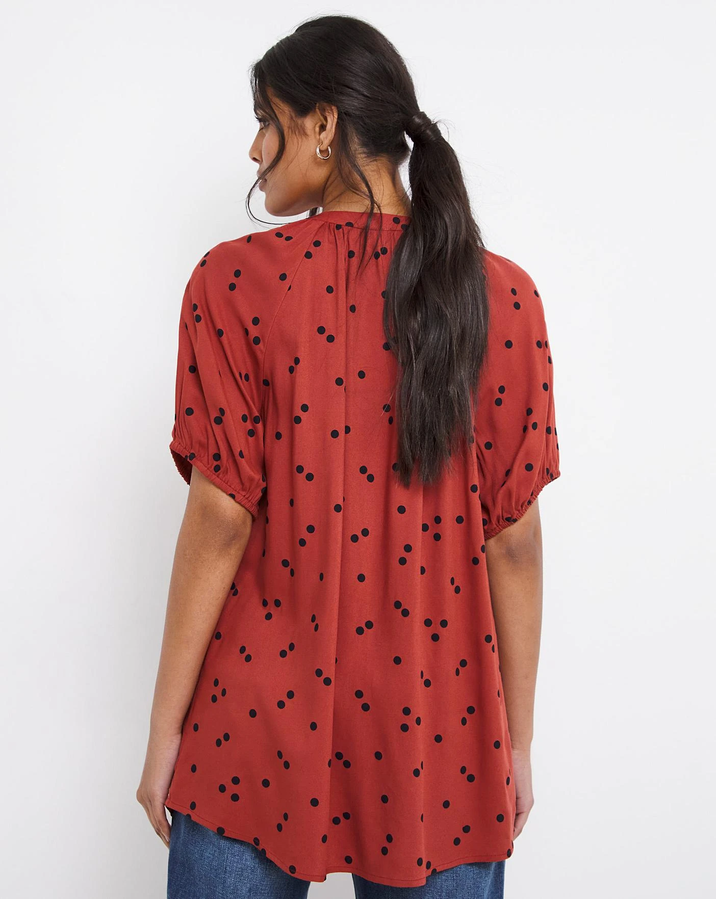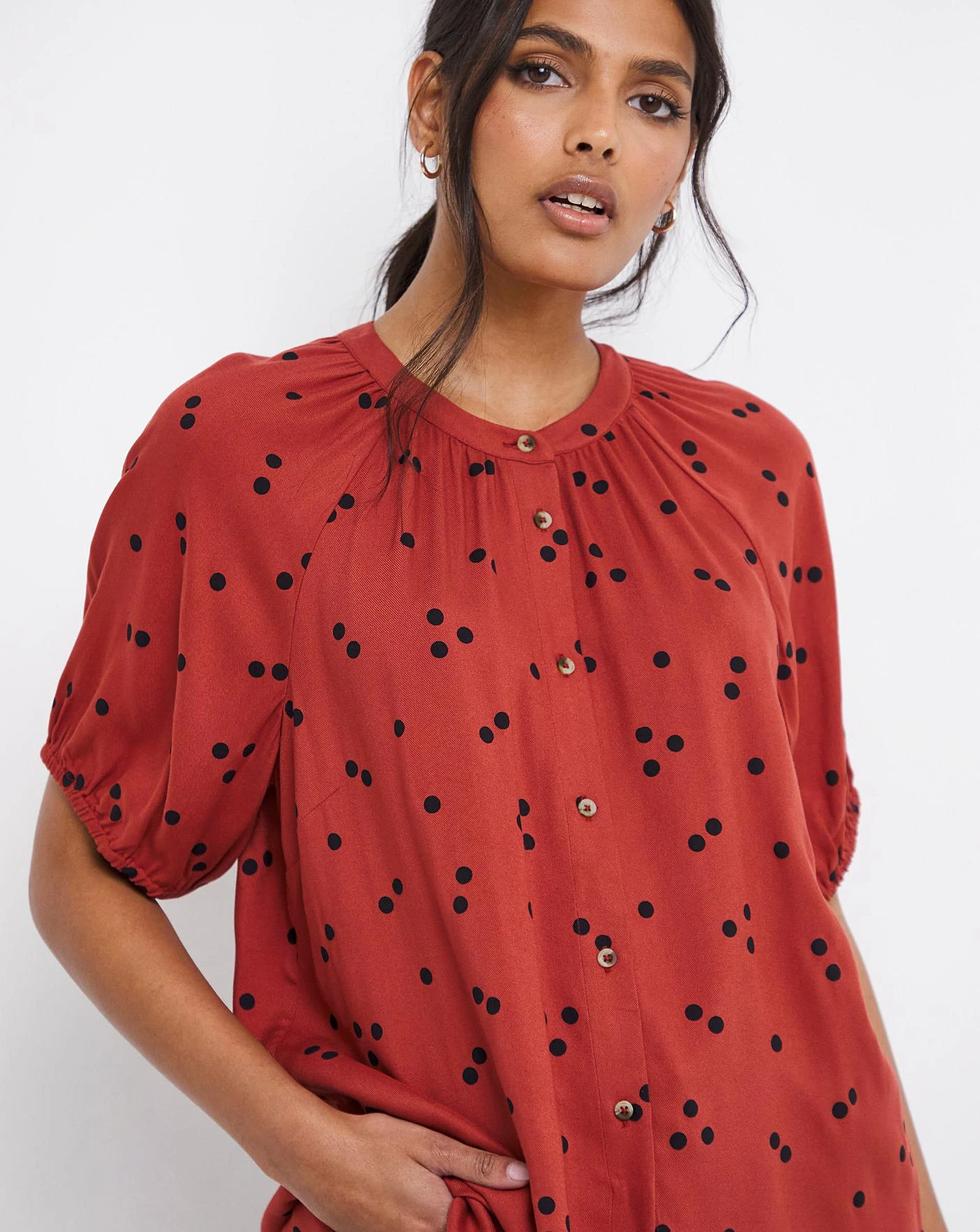 Our best-selling collarless blouse has had an update! In a fresh new colour and mock horn buttons this blouse is the perfect easy throw on with jeans or trousers. This blouse features short puff sleeves and elasticated cuffs, this blouse comes in a relaxed fit.