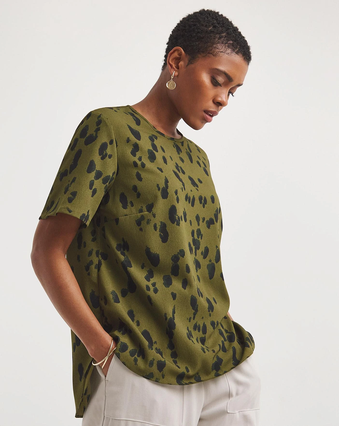 Our short sleeve top is back with a fresh print. To style your outfit, our short sleeve woven tops can be worn over jeans or tucked in for a different look. In 100% non-stetch polyester, this top will feel soft on the skin and the boxy shape allows for a relaxed and comfortable fit.